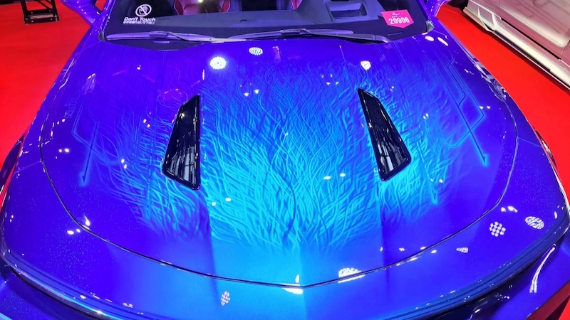 「グラインダータトゥー」は熟練の職人が、車体のボディに直接ラインを彫り込みます。光が当たるたびに浮かび上がる無数の曲線は、圧倒的な存在感とインパクトを演出。